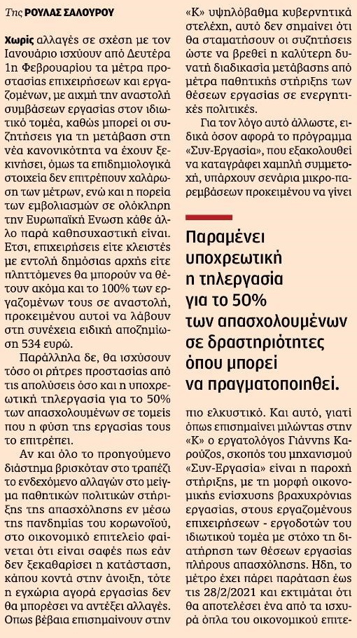 Επικαιρότητα ΑΝΑΣΤΟΛΗ ΣΥΜΒΑΣΕΩΝ ΚΑΙ ΤΟΝ ΦΕΒΡΟΥΑΡΙΟ By dikionsc - January 31, 2021 0 20 FacebookTwitterWhatsAppViber Παραμένει υποχρωτική η τηλεργασία για το 50% των απασχολουμένων σε δραστηριότητες όπου μπορεί να πραγματοποιηθεί.