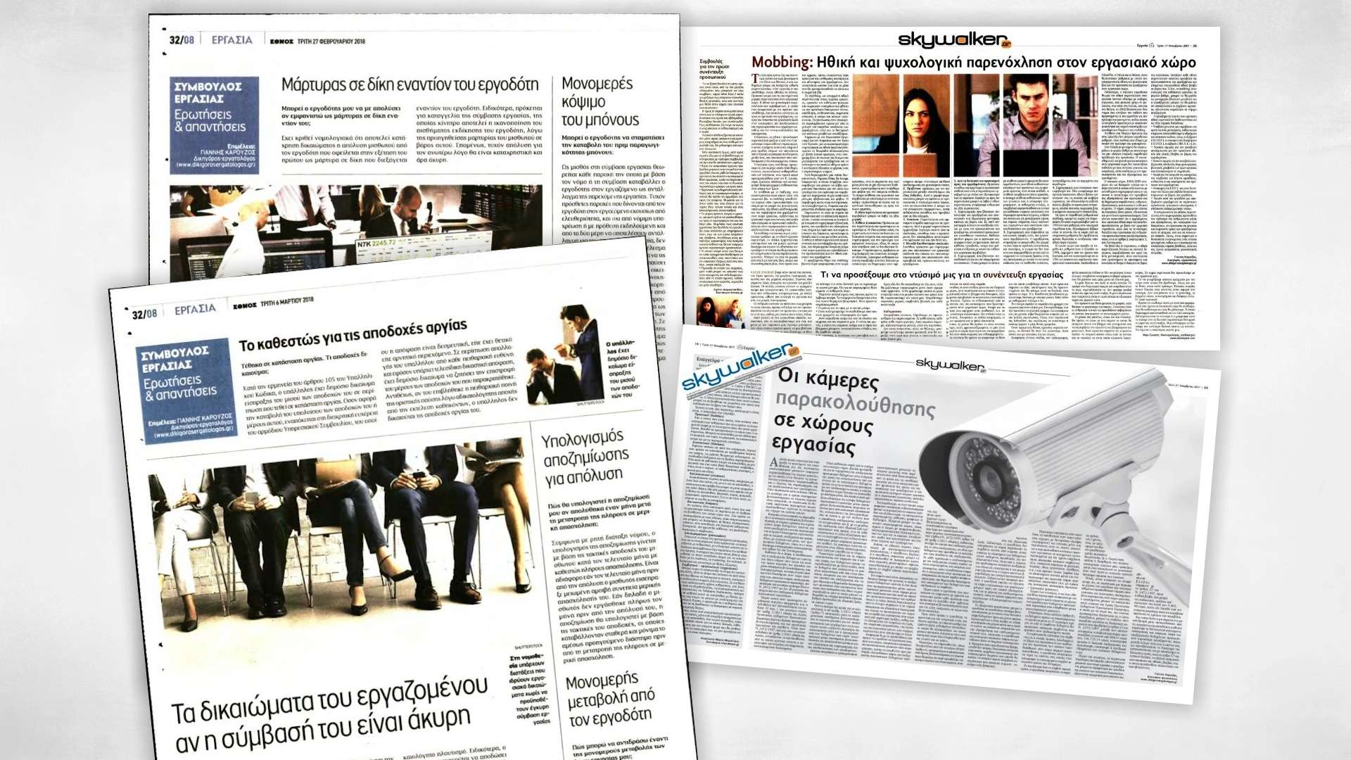 στο ένθετο “Εργασία” της εφημερίδας Έθνος απαντάει σε ερωτήσεις και απορίες σχετικά με προβλήματα εργασιακής φύσης που απασχολούν τους αναγνώστες της εφημερίδας.