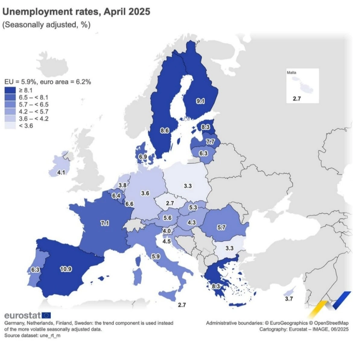 Δημοσιεύθηκαν ήδη από την στατιστική υπηρεσία της Ευρωπαϊκής Ένωσης (Eurostat) τα τελευταία στοιχεία για τα ποσοστά ανεργίας στην Ζώνη του Ευρώ[1] και την Ευρωπαϊκή Ένωση[2] εν γένει, αναφορικά με τον μήνα Απρίλιο 2025. Σύμφωνα με αυτά, κατεγράφη μείωση του ποσοστού ανεργίας στην ευρωζώνη, με αυτό να ανέρχεται στο 6,2% [από 6,3% τον μήνα Μάρτιο 2025 και από 6,4% τον αντίστοιχο μήνα του προηγούμενου έτους (Απρίλιο του 2024)]. Για την Ευρωπαϊκή Ένωση, το ποσοστό ανεργίας διαμορφώθηκε στο 5,9%, παραμένοντας σταθερό σε σύγκριση με τον Μάρτιο του 2025 και μειωμένο από το 6,0% που είχε ανέλθει τον Απρίλιο του 2024. Η Eurostat εκτιμά ότι 12.902 εκατομμύρια άτομα στην Ε.Ε., εκ των οποίων 10.680 εκατομμύρια στη ζώνη του ευρώ, ήταν άνεργοι τον Απρίλιο του 2025.