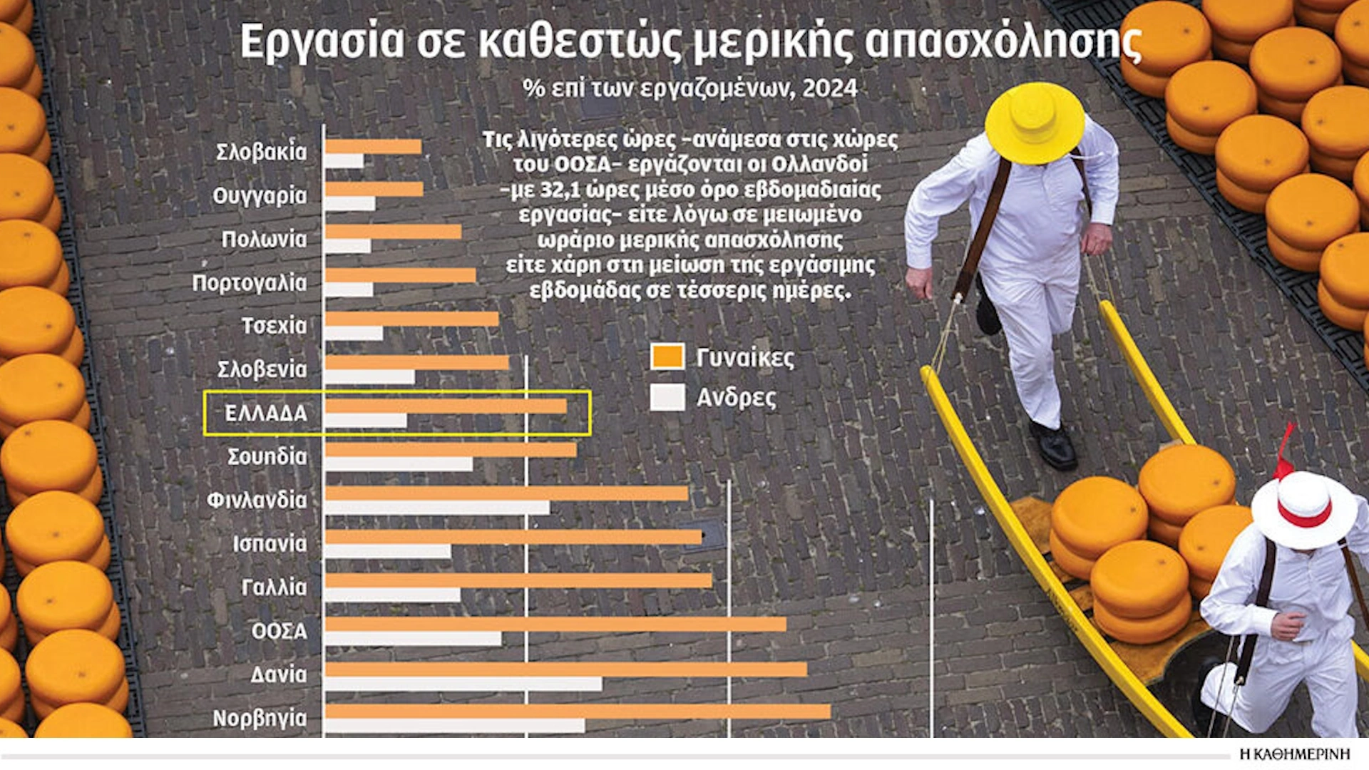 Το παράδειγμα των νέων εργασιακών σχέσεων δίνει η Ολλανδία, όπου ο μέσος όρος ωρών απασχόλησης διαμορφώνεται στις 32,1 την εβδομάδα για τους 20 με 64 ετών, ο χαμηλότερος των χωρών της Ε.Ε., σύμφωνα με τη Eurostat. Ολοένα και περισσότεροι Ολλανδοί εργαζόμενοι επιλέγουν τώρα να συμπιέσουν τις εβδομαδιαίες ώρες εργασίας τους, δουλεύοντας τέσσερις ημέρες την εβδομάδα. «Η εβδομάδα των τεσσάρων ημερών έχει καταστεί πολύ δημοφιλής. Συνεχίζω να εργάζομαι πενθήμερο και δέχομαι κριτική γι’ αυτό», λέει ο Μπερτ Κολάιν, οικονομολόγος της τράπεζας ING.