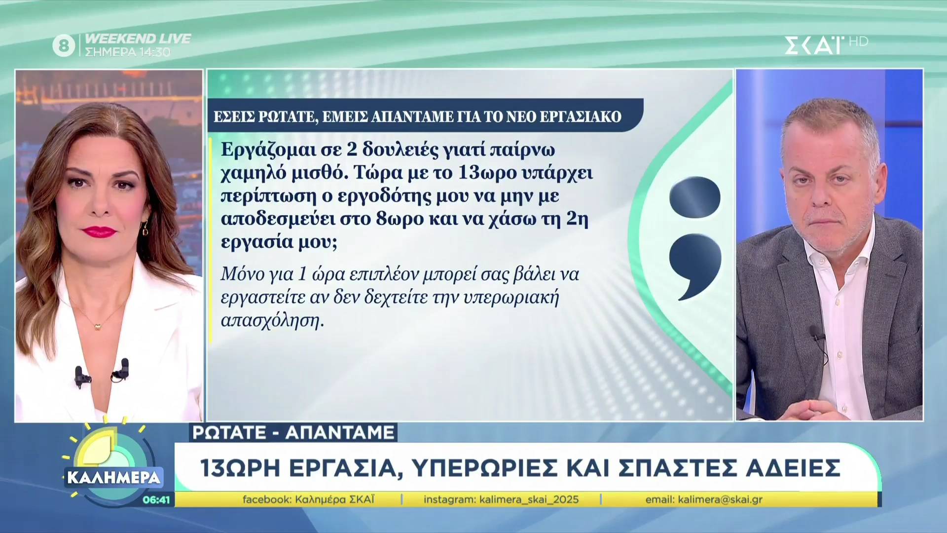 Ο εργατολόγος Γιάννης Καρούζος καλεσμένος στον ΣΚΑΪ και στη πρωινή ενημερωτική εκπομπή ΚΑΛΗΜΕΡΑ με την Φαίη Μαυραγάνη, σχολιάζει τις τελευταίες εξελίξεις στα εργασιακά.