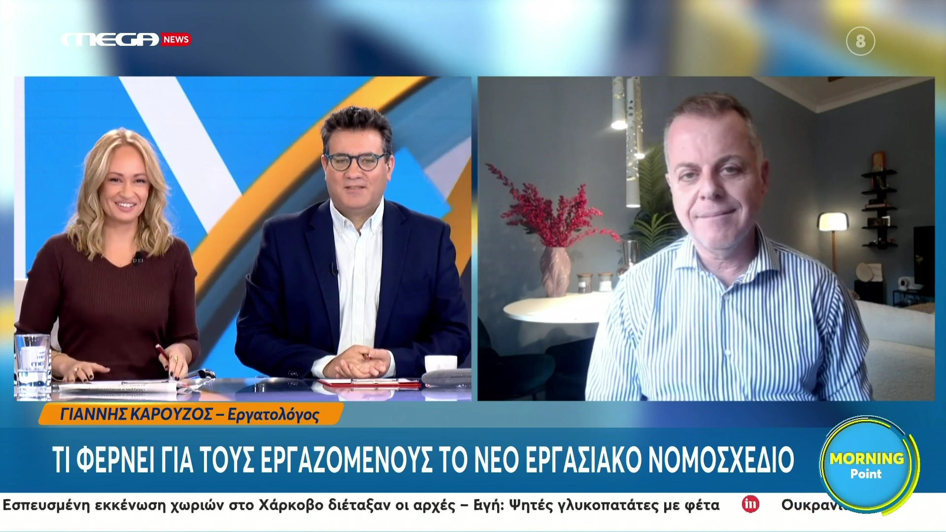 Συνεντεύξεις Ο χρόνος απασχόλησης το πρώτο θέμα στην χώρα! By dikionsc - October 15, 2025 0 470 FacebookTwitterWhatsAppViber Ο εργατολόγος Γιάννης Καρούζος καλεσμένος στo MegaNews σχολιάζει τις τελευταίες εξελίξεις στα εργασιακά. Δείτε το video